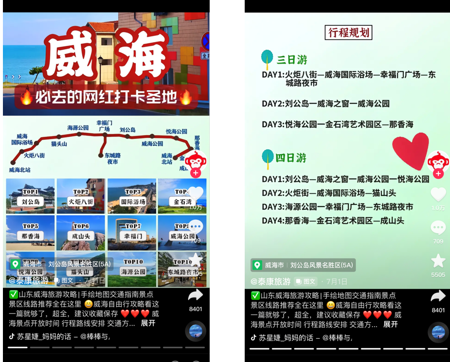 ●短視頻行業(yè)與其他行業(yè)的融合:例如政務(wù)領(lǐng)域,當(dāng)前政務(wù)短視頻、政務(wù)內(nèi)容直播在政務(wù)消息傳達(dá)和政府形象塑造等方面極大得提升了效率與關(guān)注度;互聯(lián)網(wǎng)助農(nóng)領(lǐng)域,前有央視主持人聯(lián)合頭部主播助農(nóng),后有以抖快為代表的短視頻平臺(tái)助力三農(nóng),對(duì)該領(lǐng)域用戶給予流量支持,部分博主在當(dāng)?shù)赜辛俗约旱墓?,持續(xù)助力鄉(xiāng)村振興;在文旅領(lǐng)域,非遺的手藝人入駐平臺(tái),傳播傳統(tǒng)文化;美景和攻略視頻讓小眾旅行地也成為消費(fèi)者新的選擇,今年夏天,在短視頻宣傳和用戶主動(dòng)打卡宣傳中,威海成功出圈,成為旅游熱度漲幅前十城市。