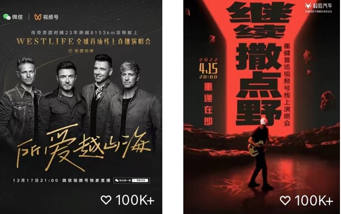此外,微信視頻號(hào)背靠微信龐大的流量和熟人社交模式,成為微信生態(tài)和商業(yè)變現(xiàn)的重要板塊。摸著抖快過(guò)河的視頻號(hào),在上線當(dāng)年即推出直播帶貨功能。2021年又首度推出“11.11直播好物節(jié)”,截至年末,DAU(日活躍用戶數(shù)量)達(dá)5億,同比增長(zhǎng)78%,直播帶貨的銷(xiāo)售金額較年初整體增長(zhǎng)超15倍。除電商外,21-22年視頻號(hào)還打造了西城男孩演唱會(huì)(點(diǎn)贊1.64億)、崔健演唱會(huì)(4600萬(wàn)人觀看)等現(xiàn)象級(jí)爆點(diǎn)——微信先通過(guò)朋友圈廣告投放,完成定向人群曝光,用戶點(diǎn)擊廣告即可進(jìn)入直播間觀看,獲得情感共鳴后又主動(dòng)分享,傳播效果裂變式放大。線上演唱會(huì)的獲利渠道與線下基本一致但消費(fèi)更為便捷,主要包括門(mén)票收入、廣告贊助、周邊售賣(mài)等等。